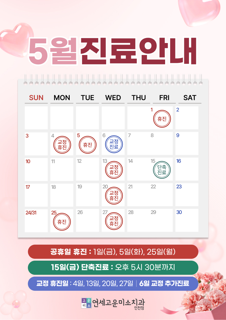 이번 달에는 아시다시피 공휴일이 많습니다. 그래서 노동절인 1일(금), 어린이날 5일(화), 대체 공휴일 25일(월)은 휴진하기로 했습니다.