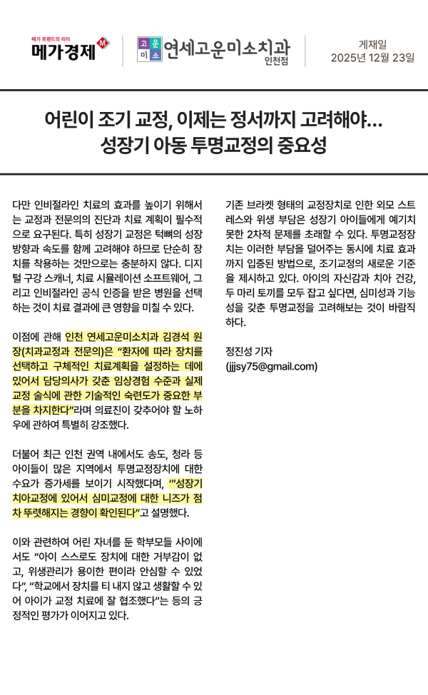 | 어린이 조기 교정, 이제는 정서까지 고려해야… 성장기 아동 투명교정의 중요성 (2025년 12월 23일 기사) 작성일 | 2026.01.02 작성자 | 관리자 |